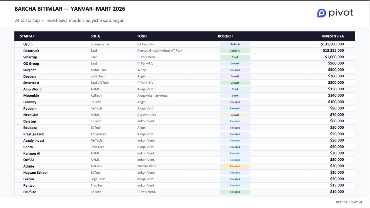 Бунинг катта қисми Uzum’га тўғри келди. Компанияга VR Capital+ томонидан 131,5 млн доллар сармоя киритилди ва бозор қиймати 2,3 млрд долларга етди.