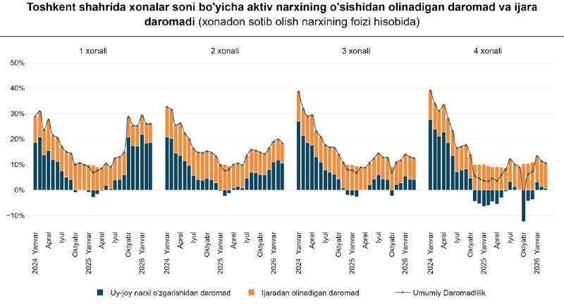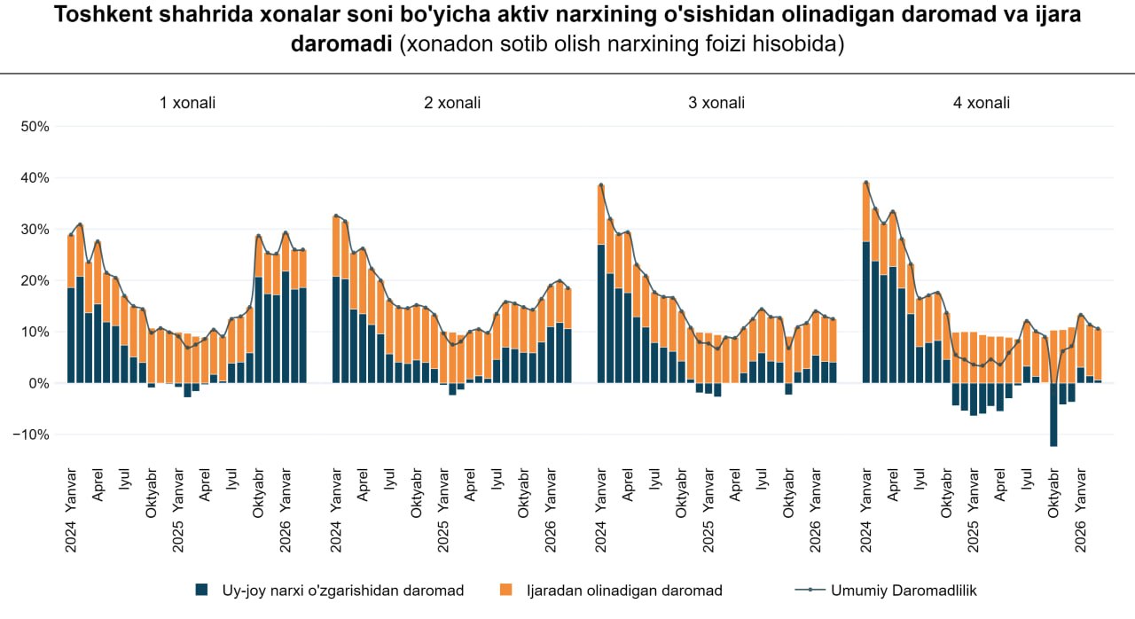 Даромадлилик даражаси бўйича инвестицион жозибадорлиги юқорироқ бўлган 1 ва 2 хонали хонадонлар учун даромадлилик даражаси мос равишда 29,8 фоиз (2025 йил март ойида 9,3 фоиз) ва 17,4 фоизни (4,8 фоиз) ташкил қилди.