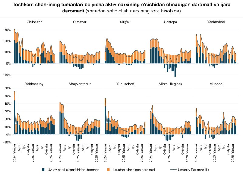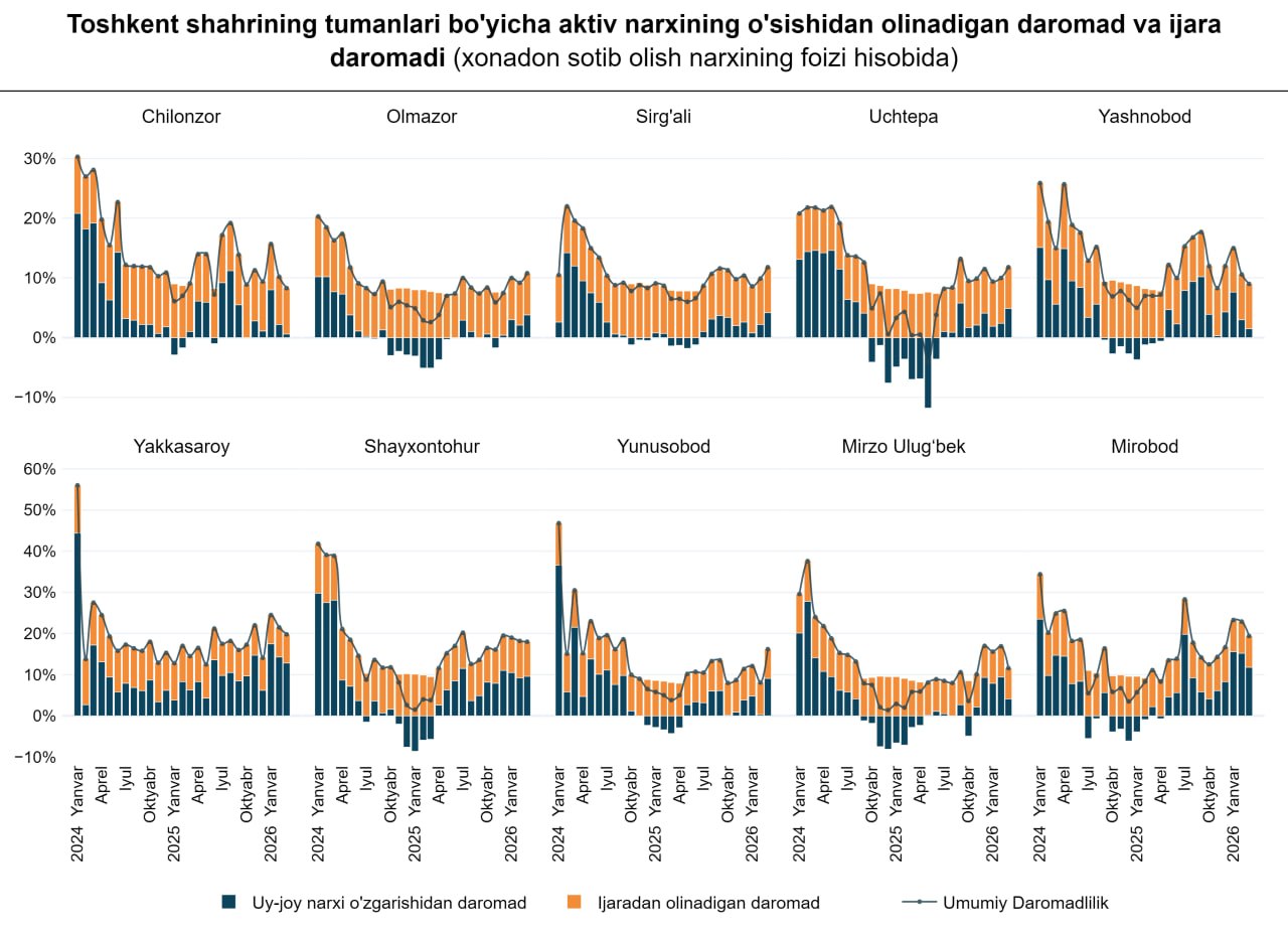 Ижара бўйича энг юқори ўртача даромадлилик Шайхонтоҳур 9,1 фоиз (9,3 фоиз) ва Яшнободда 8,4 фоиз (8,8 фоиз) қайд этилди.