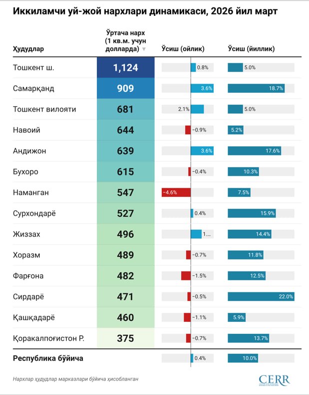 Тошкентда нархлар йиллик 5 фоизга ўсган бўлса, Сирдарёрда 22 фоизгача кўтарилган. Бутун Ўзбекистон бўйича ўсиш — 10 фоиз.