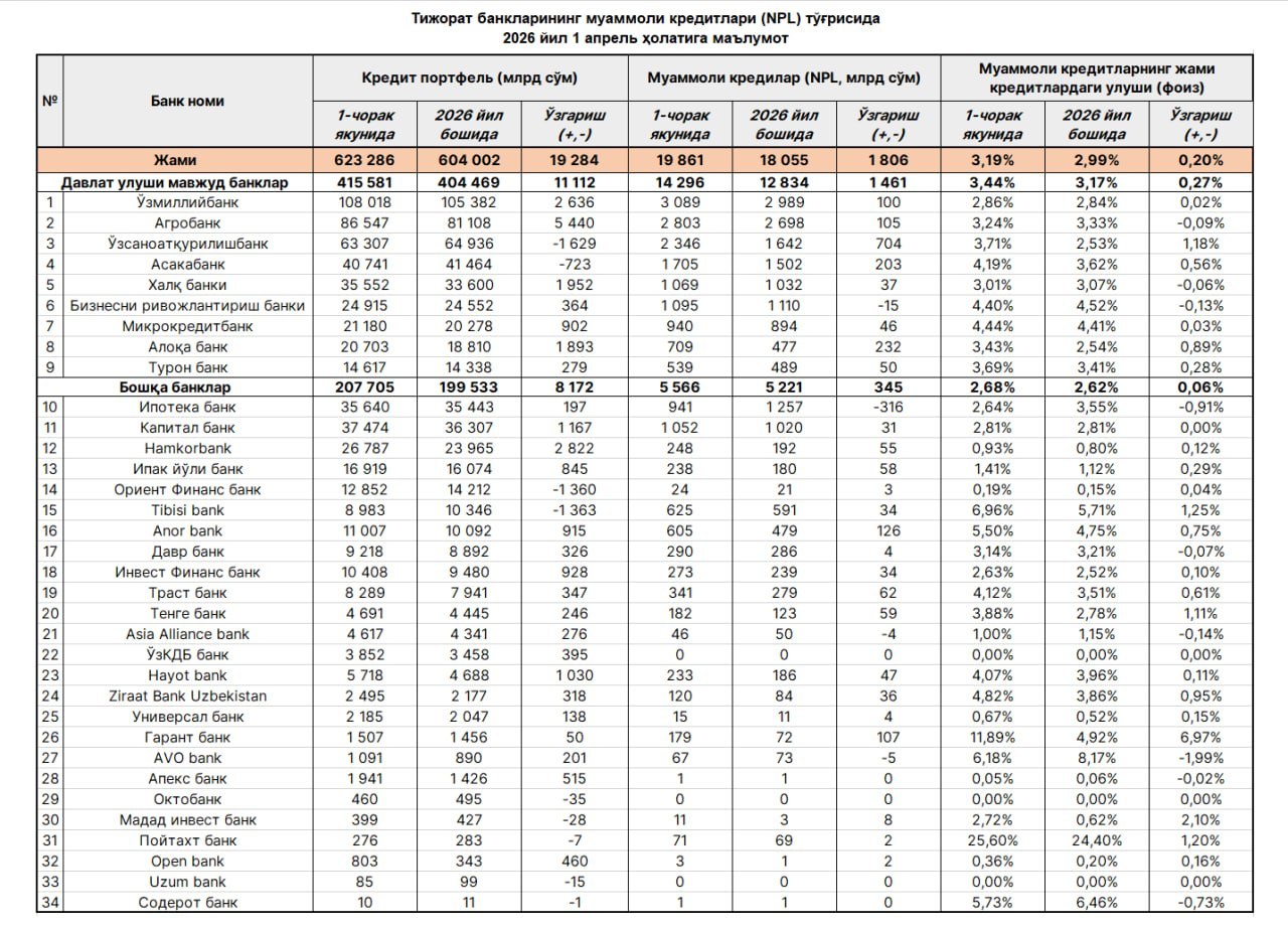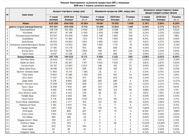 I чорак якунига кўра, Ўзбекистон банкларида муаммоли кредитлар (NPL) миқдори йил бошига нисбатан 1,8 трлн сўмга ўсиб, 19,9 трлн сўмни ташкил қилди.