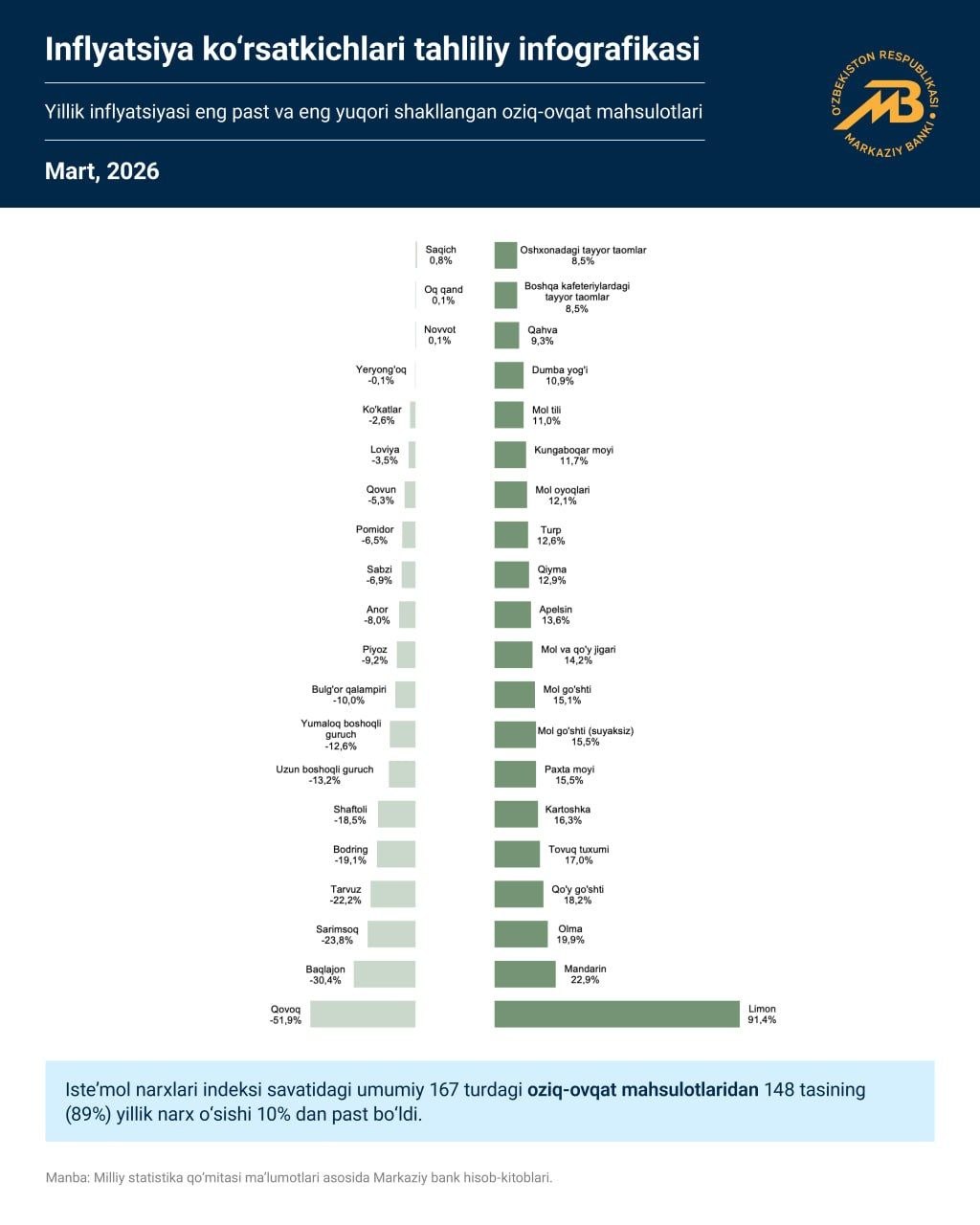 ⏺Йиллик ҳисобда озиқ-овқат маҳсулотлари орасида энг катта нарх ўсиши лимон (91,4%), мандарин (22,8%), олма (19,9%) ва қўй гўшти (18,2%) да кузатилди.