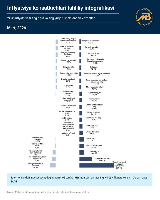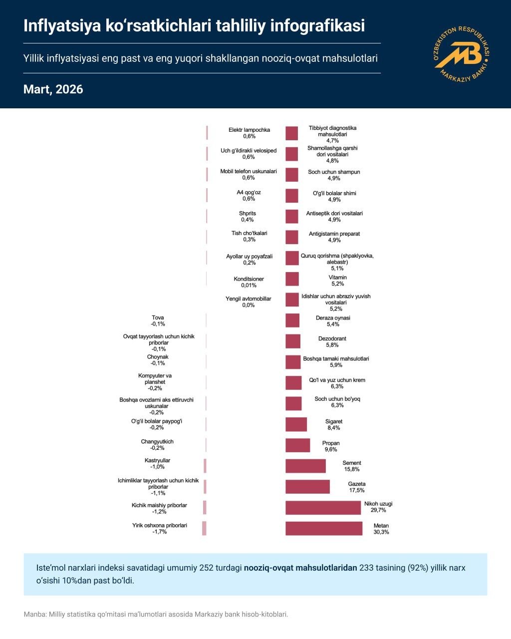 Юқоридаги расмларда 2026 йил март ойи ҳолатига кўра озиқ-овқат, ноозиқ-овқат маҳсулотлари ҳамда хизматлар кесимида нархларнинг ўсиш ёки пасайиш фоизлари кўрсатилган.