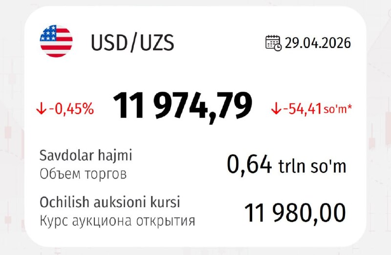 Доллар тушди 30 апрель учун долларнинг расмий курси 11 974,79 сўм (-54,41 сўм) ҳисобланади @bankir Post menyusi [Photo] Click иловасида пул ўтказмалари учун комиссия 1 фоиздан 1,1 фоизга оширилибди. ❗️Шу тариқа расмий курс 12 000 сўмдан пастлаб, 19 январдан бери энг паст даражага тушди.