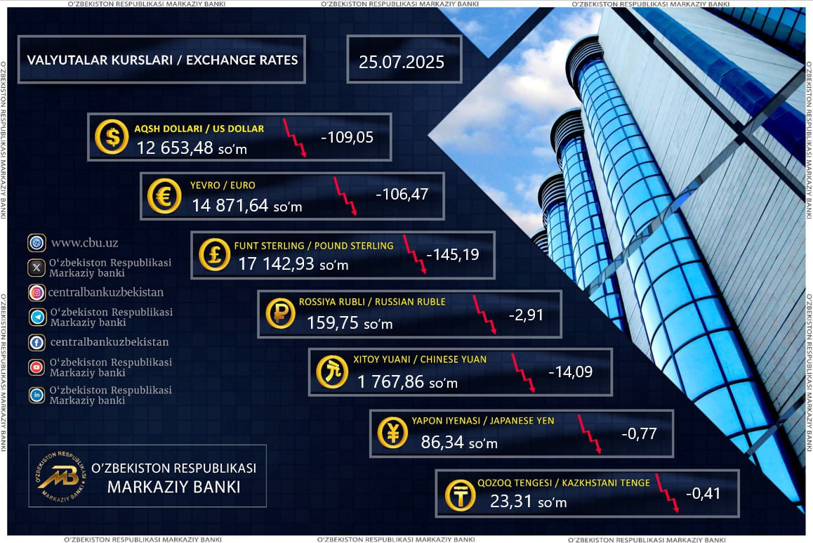 Сўмнинг қаршилигидаги долларнинг расмий курси 25-июль куни 12 653,48 сўмга тенг бўлиб, унда 109,05 сўмга камайиш киритди.